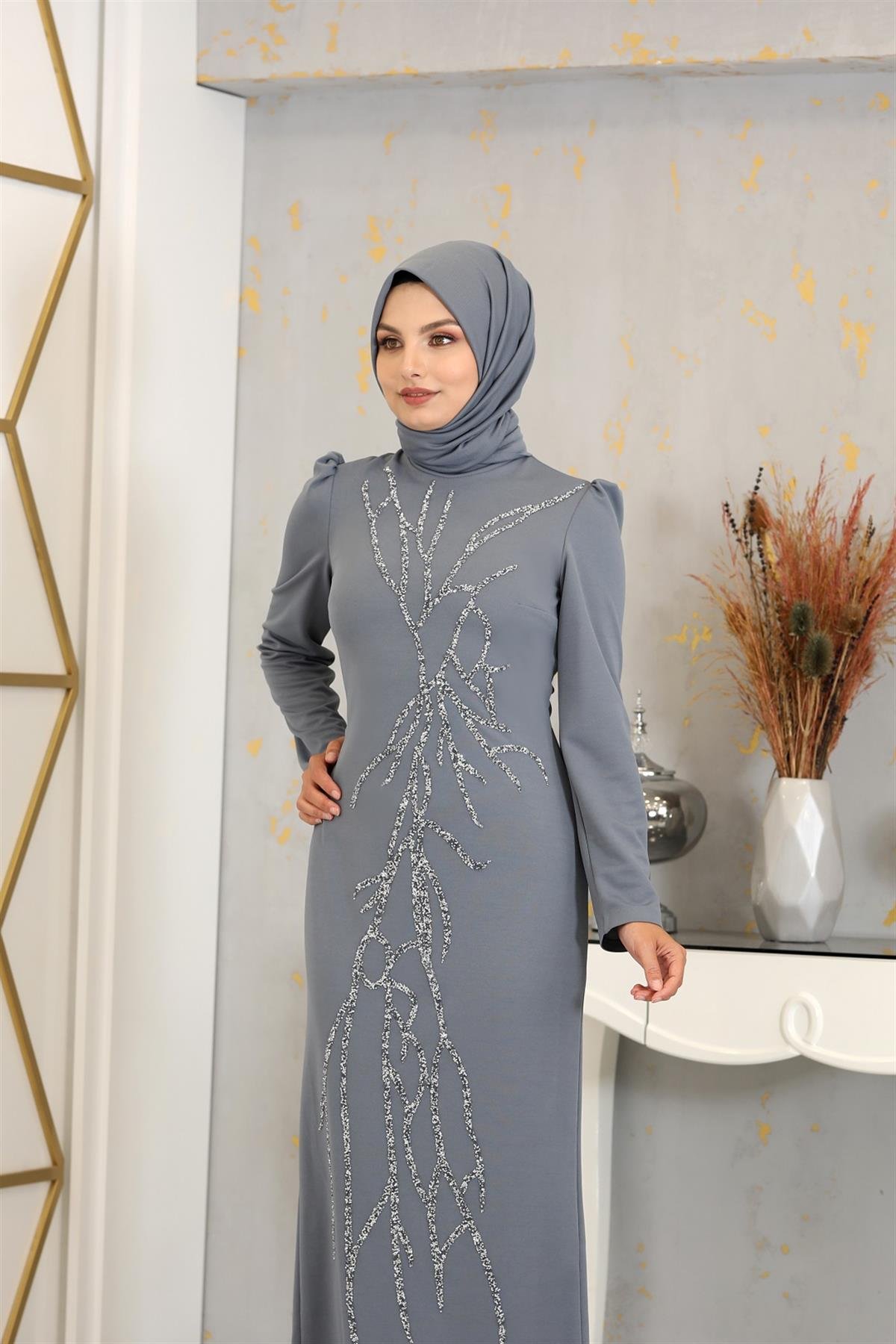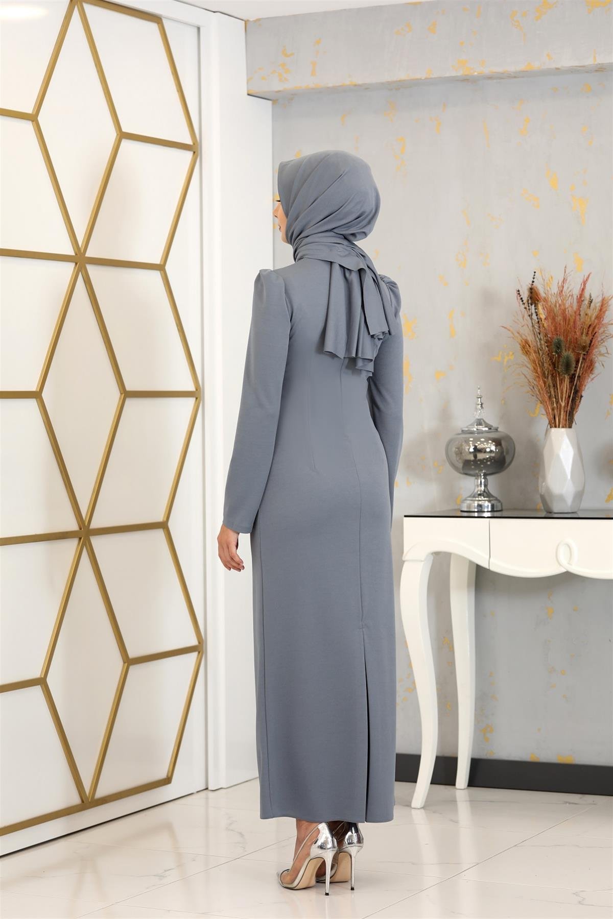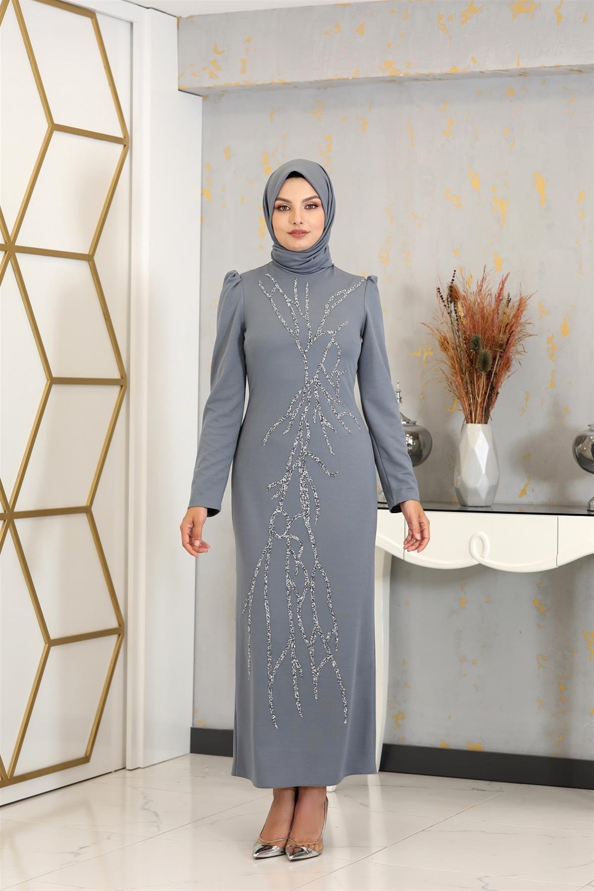 Aplik İşlemeli Kalem Tuana Kalem Tesettür Elbise - Gri (tuana0001)