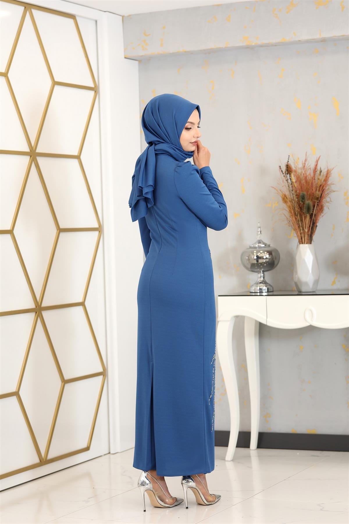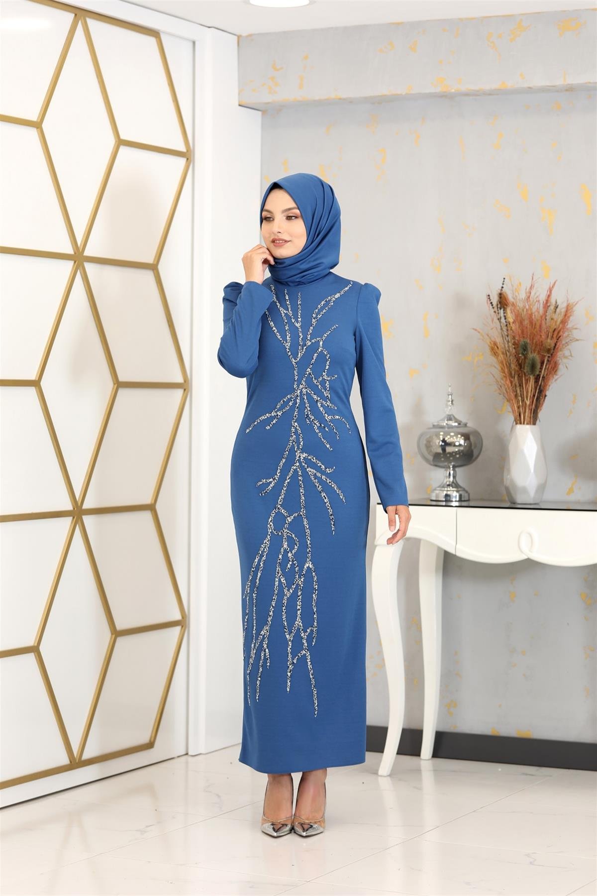Aplik İşlemeli Kalem Tuana Kalem Tesettür Elbise - İndigo (tuana0004)