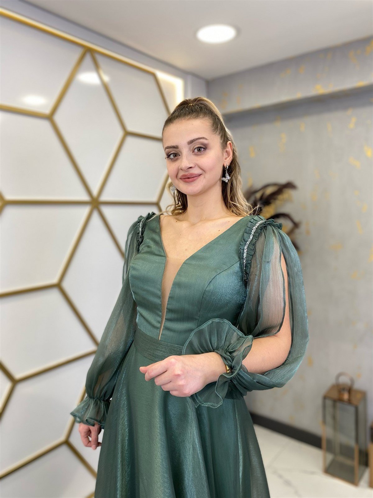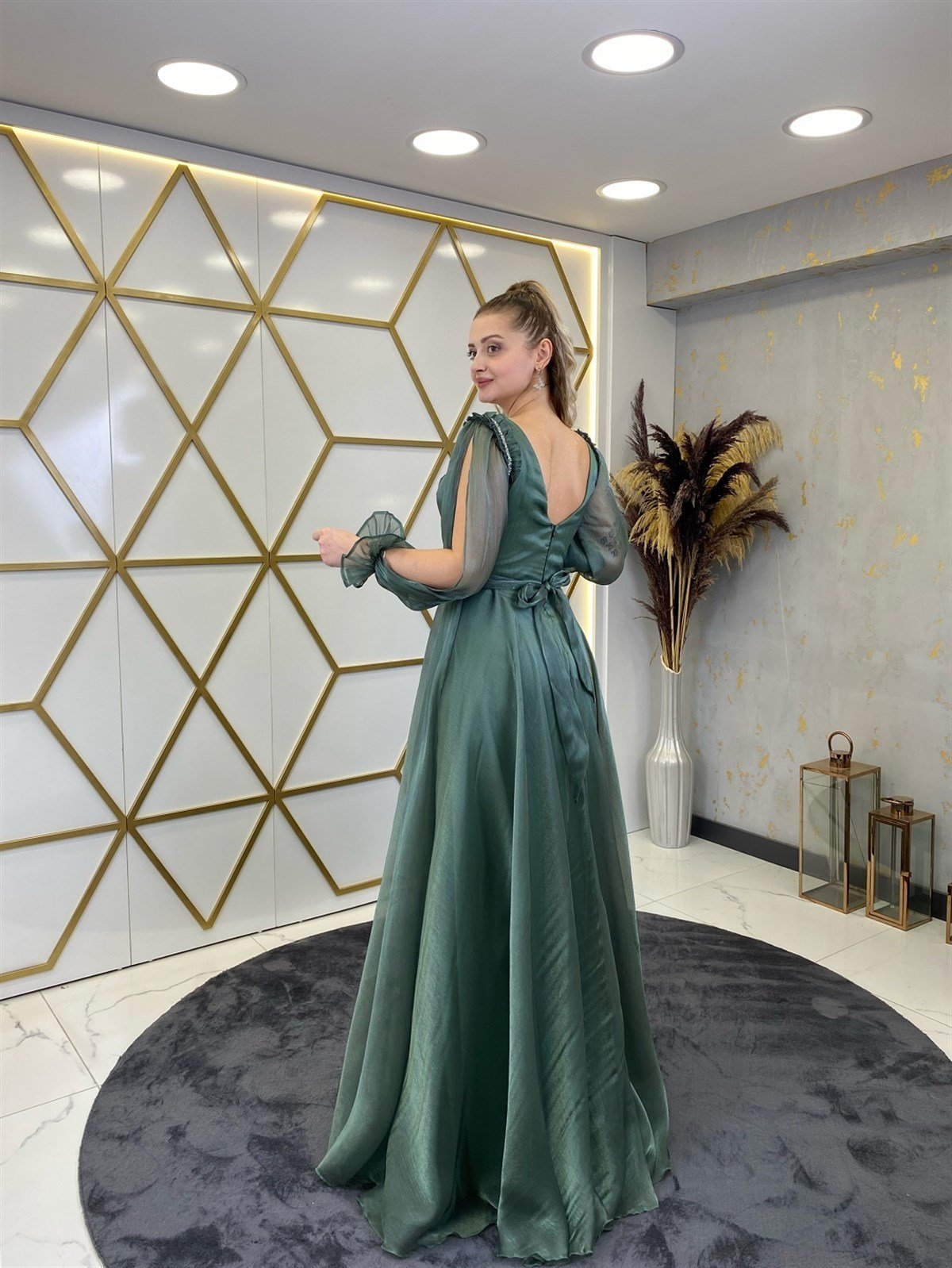 Beli Kuşaklı Taş Detaylı V Yaka Sena Abiye - Haki