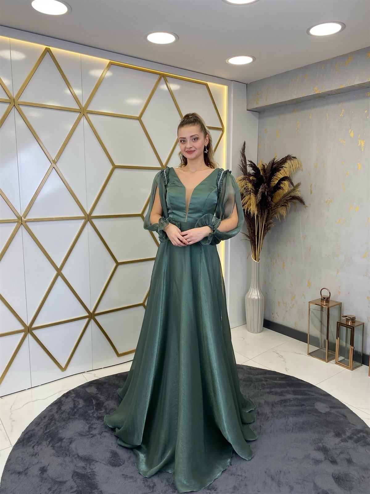 Beli Kuşaklı Taş Detaylı V Yaka Sena Abiye - Haki (sena0003)