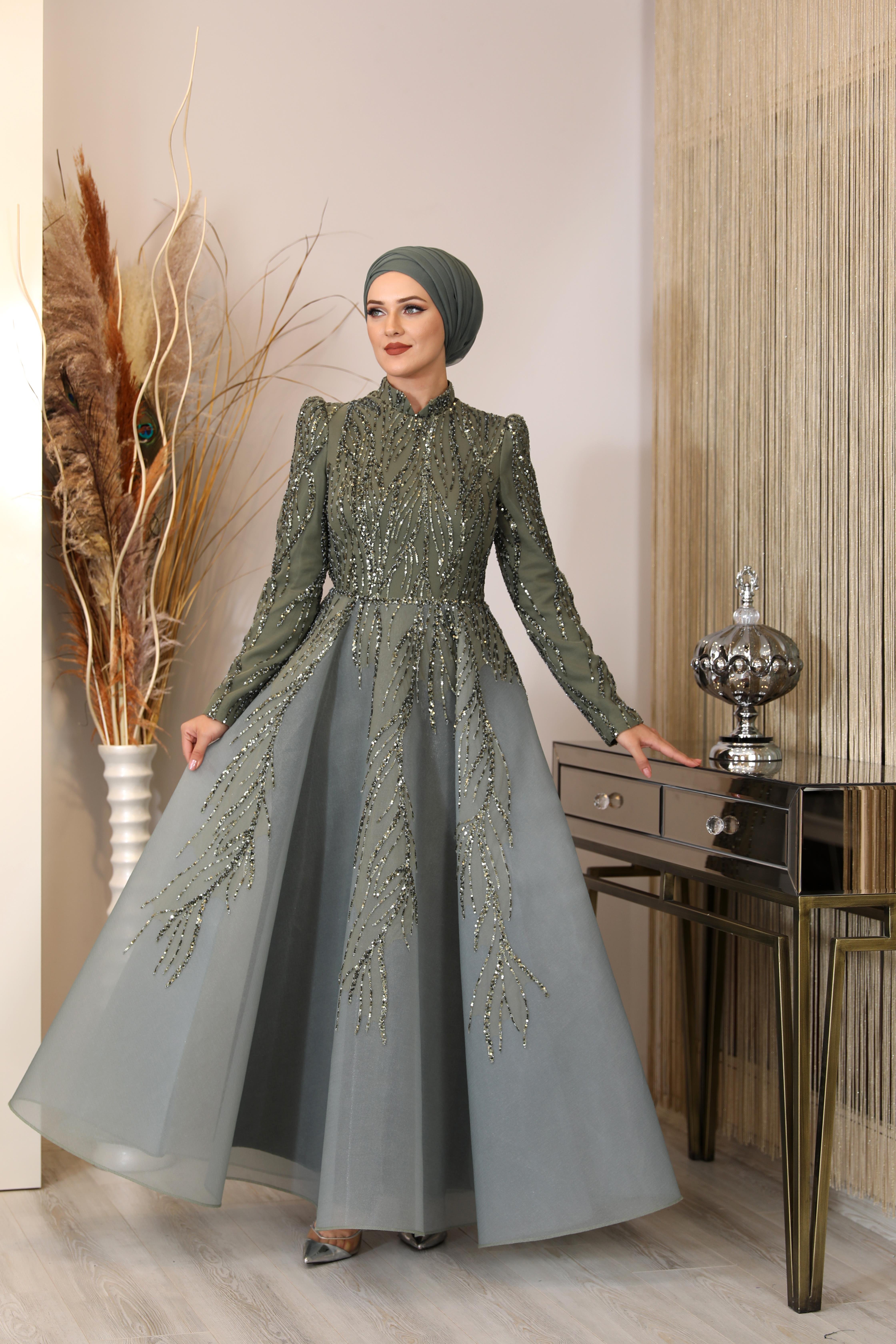 Önü Aplik Detaylı Arkadan Bağcıklı Prenses Abiye - Haki