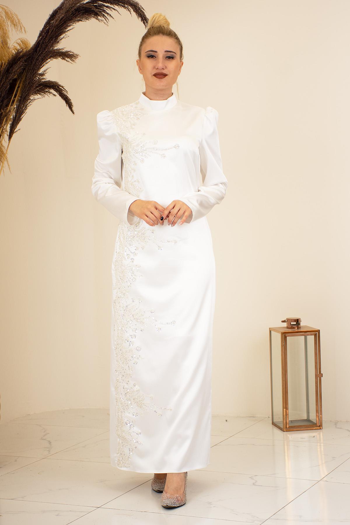 Önü Aplik işlemeli Kalem Hilal Tesettür Abiye - Beyaz (hilal0001)