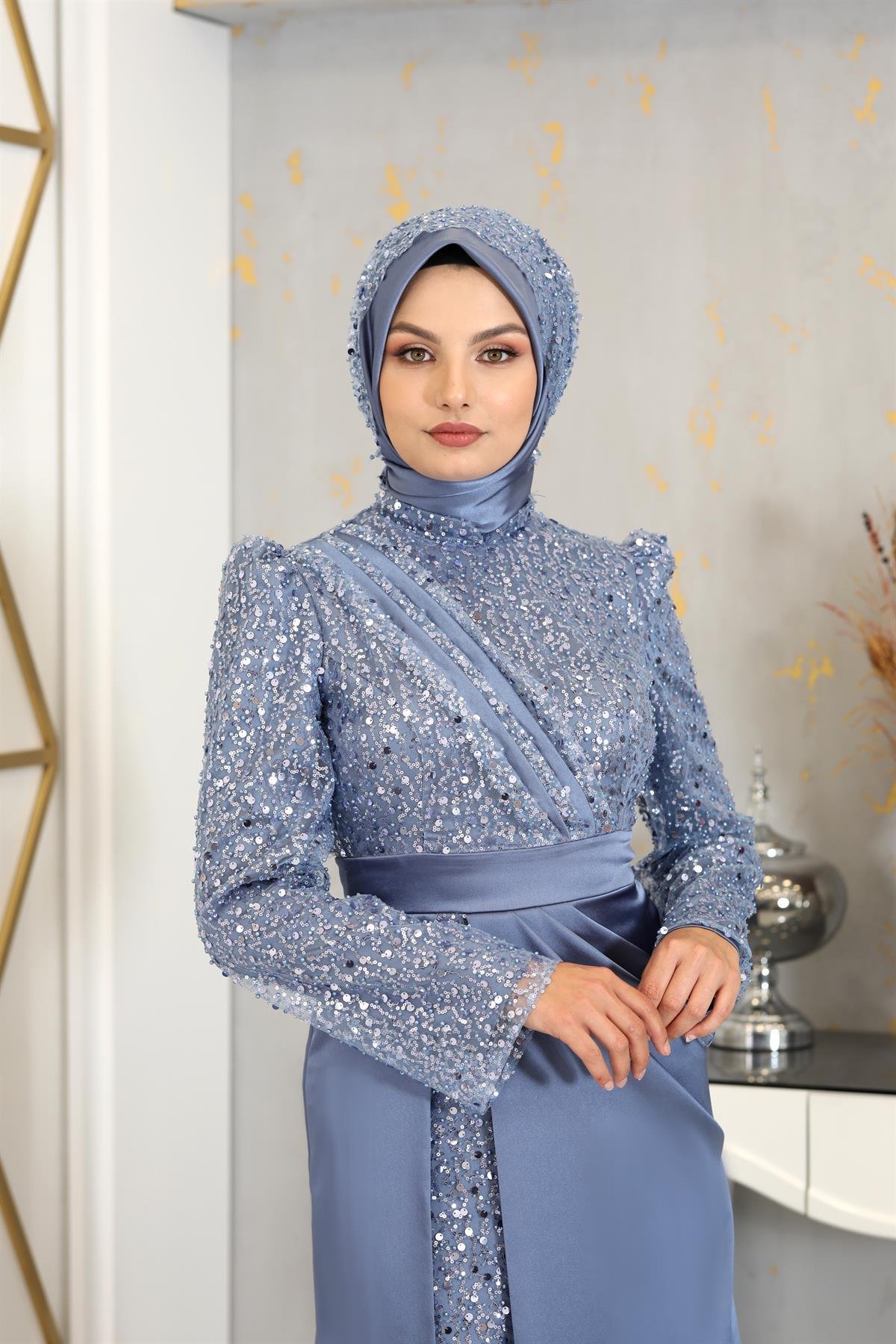 فستان سهرة شهرزاد مع ثنى نيلي مطرز مطرز بالترتر (sehrazat0001)