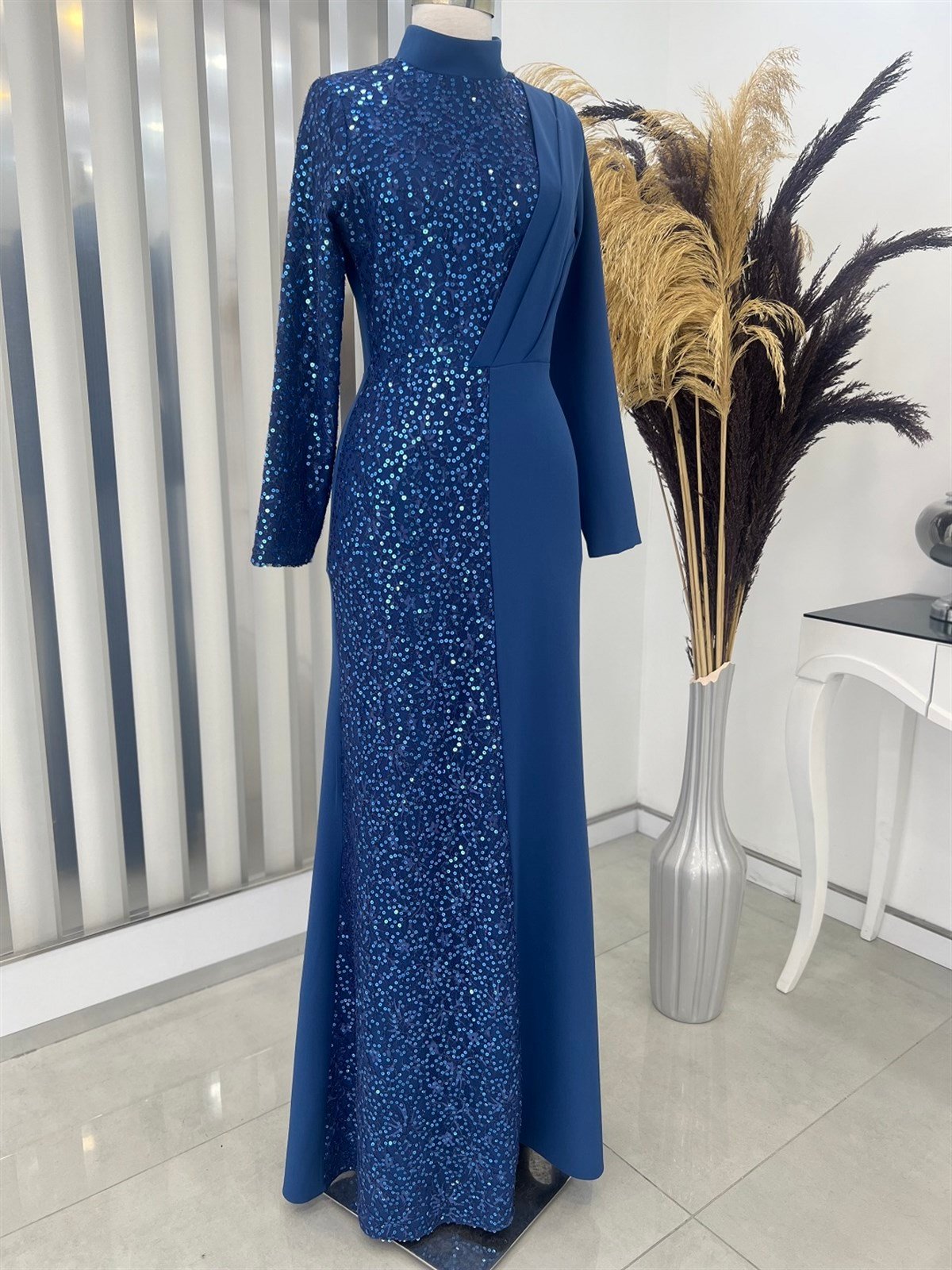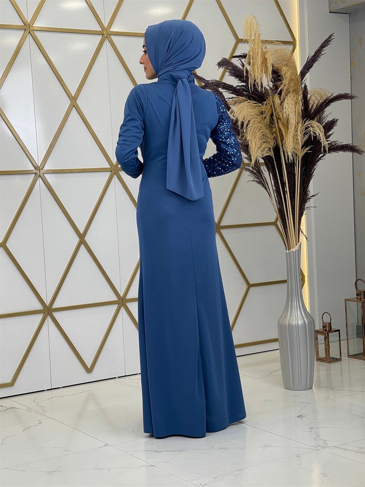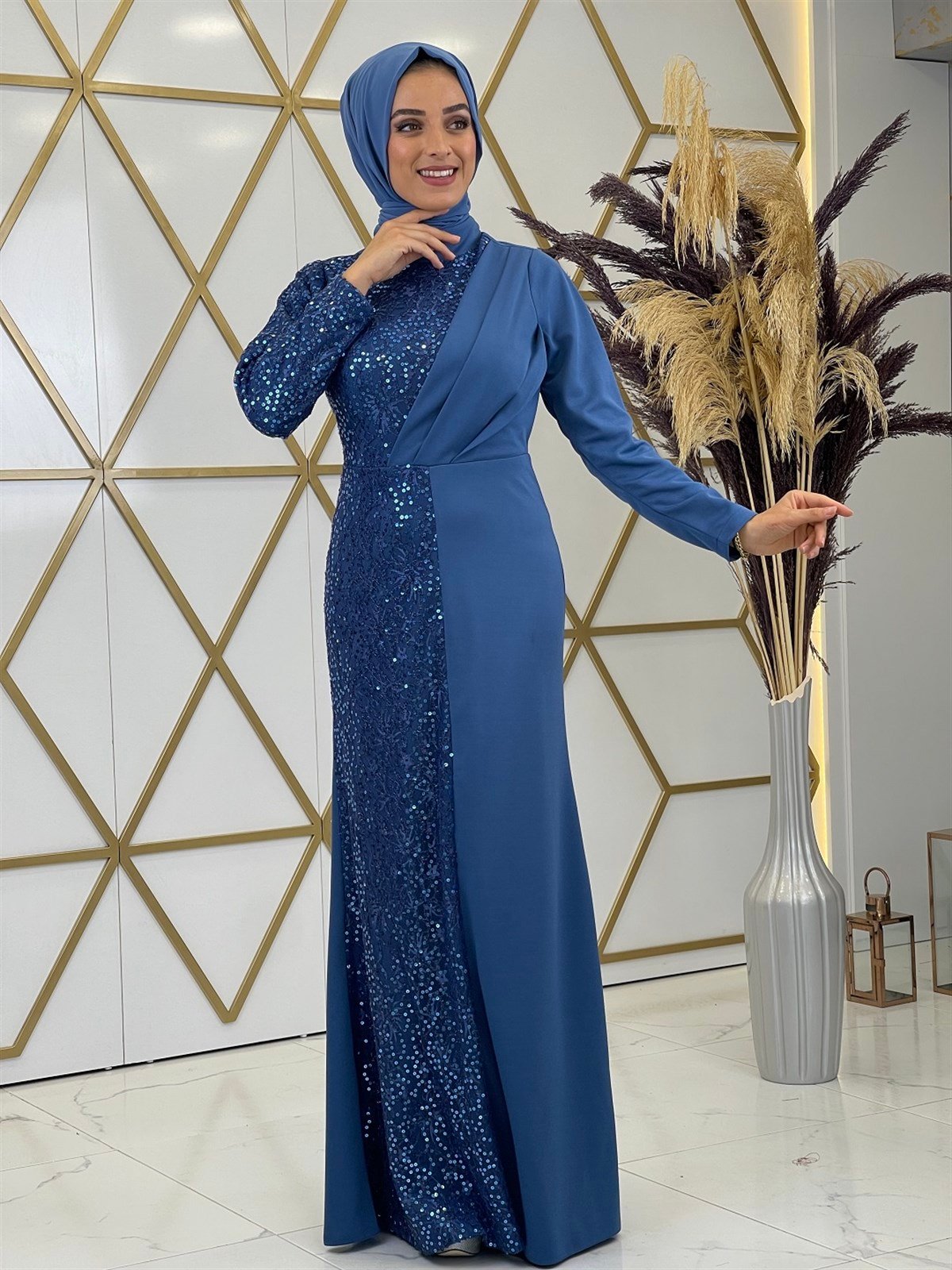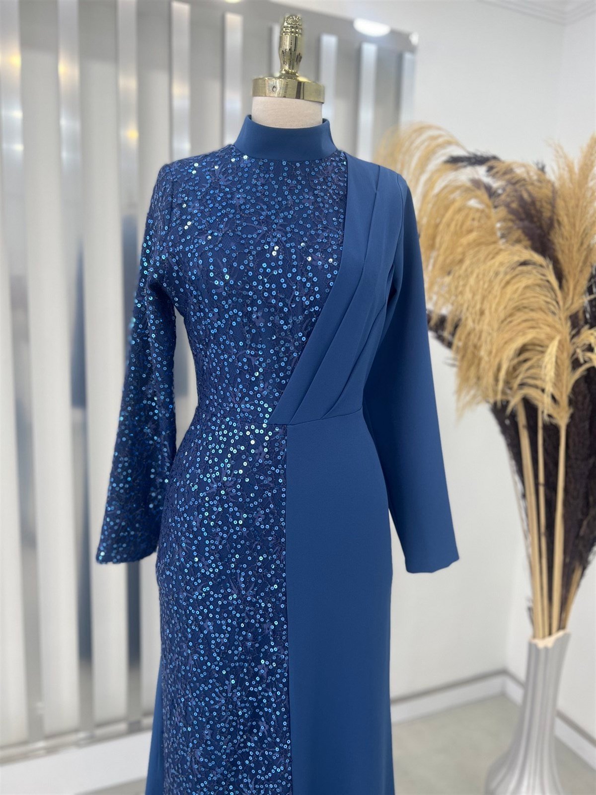 Açelya Pul Payetli Gizli Fermuarlı Tesettür Abiye - İndigo (mera0005)