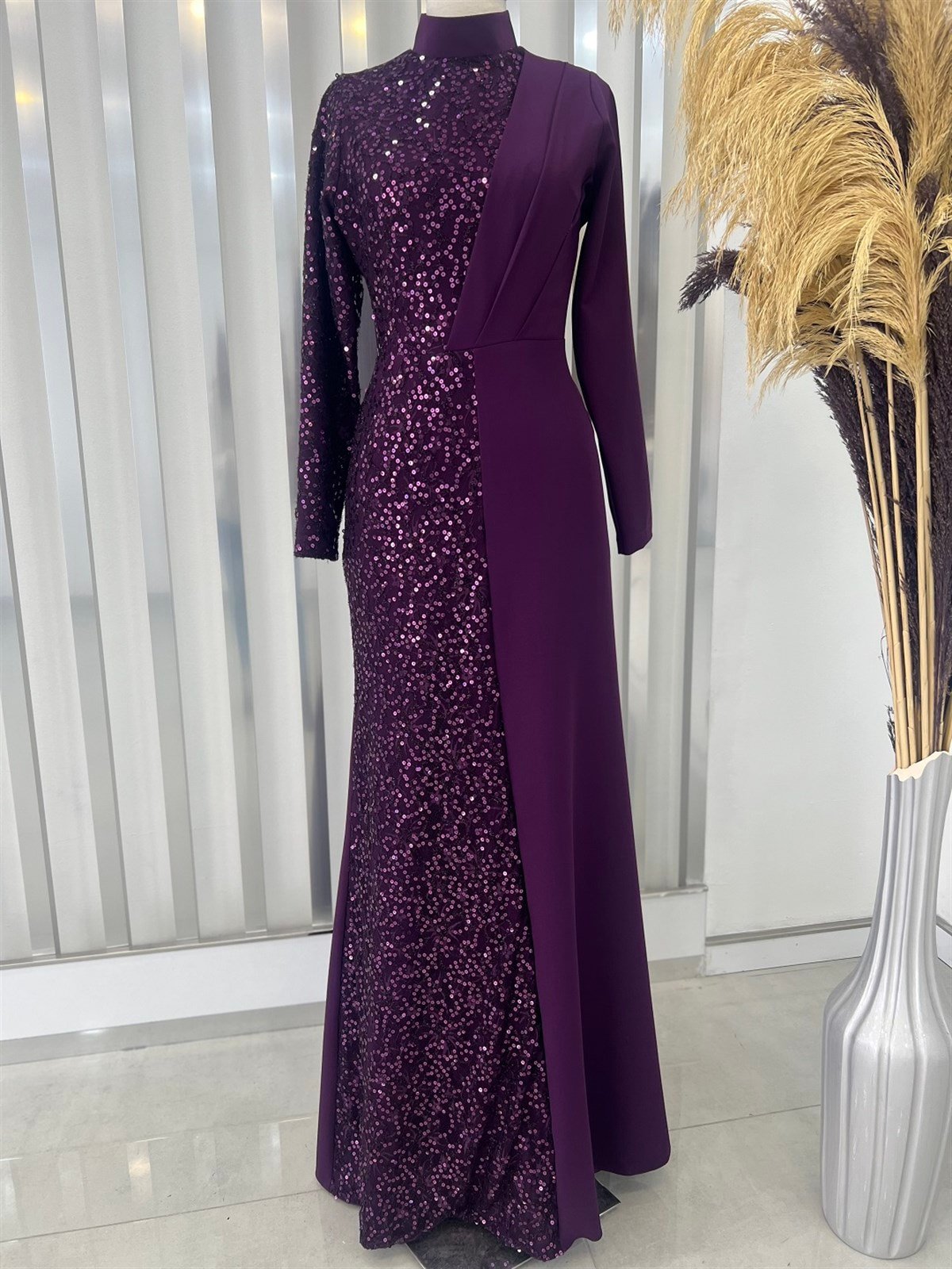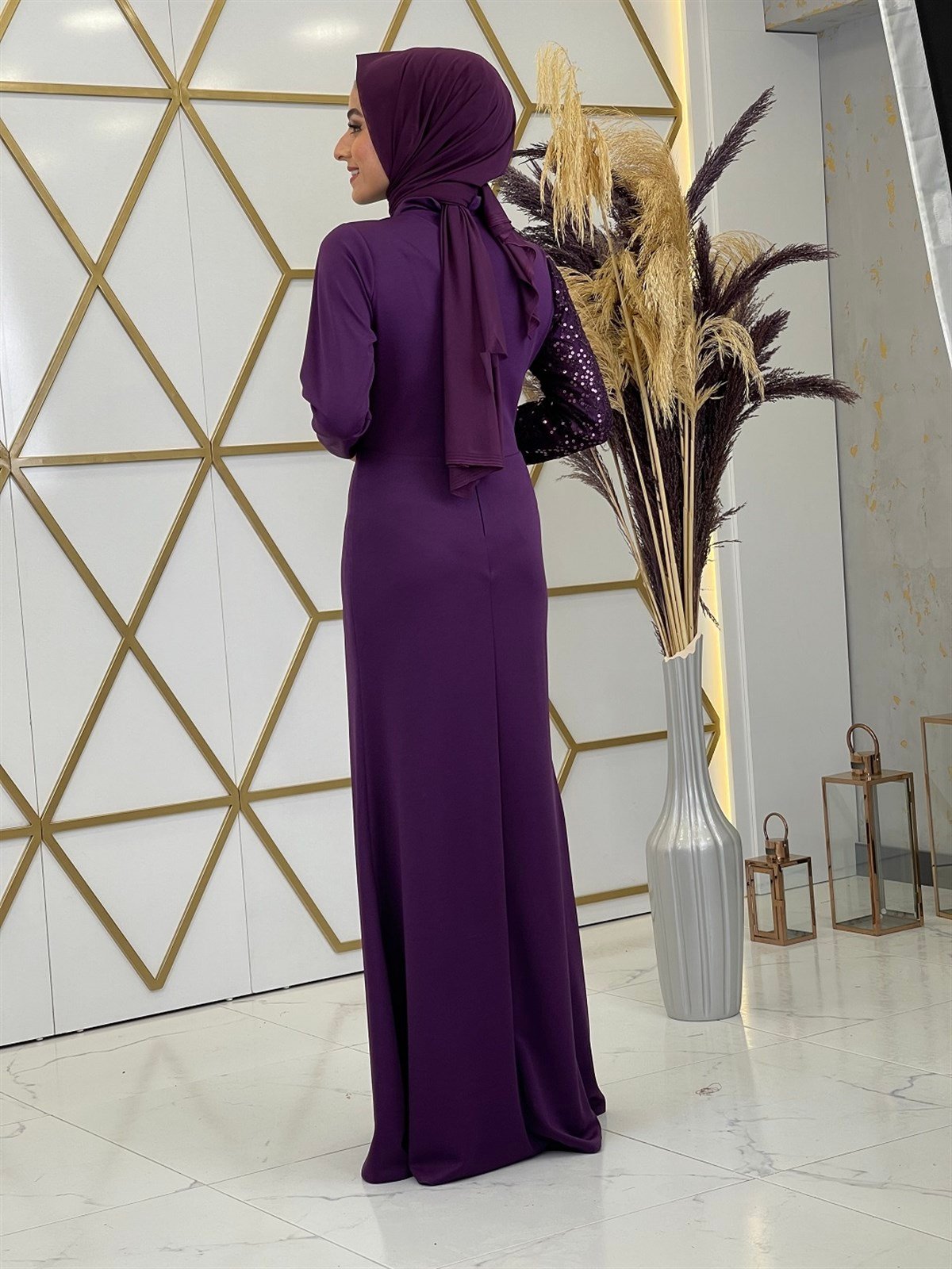 Açelya Pul Payetli Gizli Fermuarlı Tesettür Abiye - Mürdüm (mera0004)
