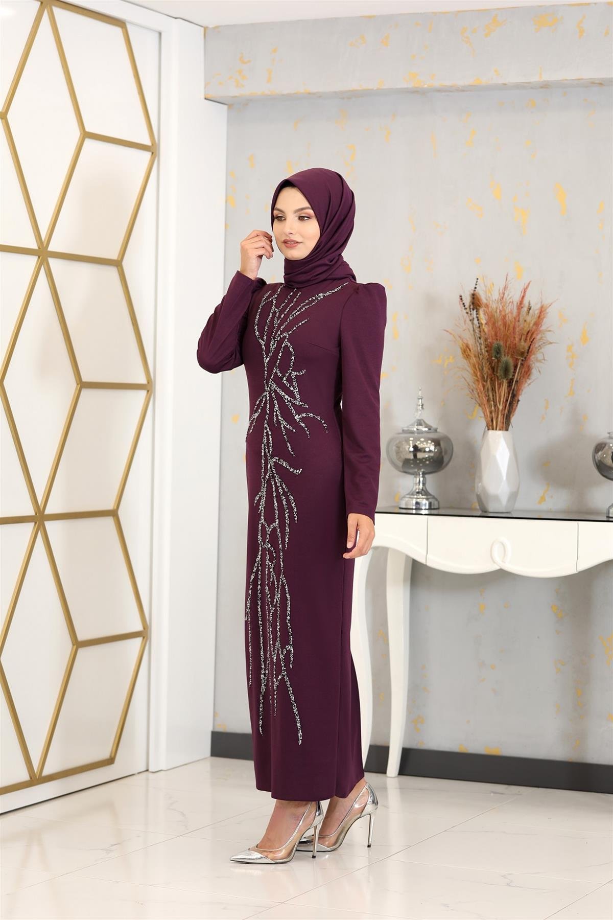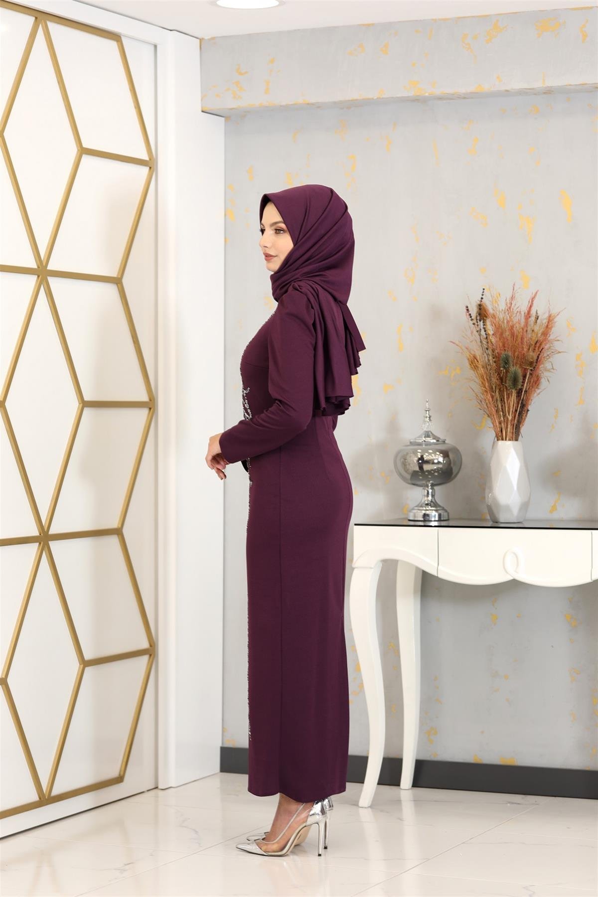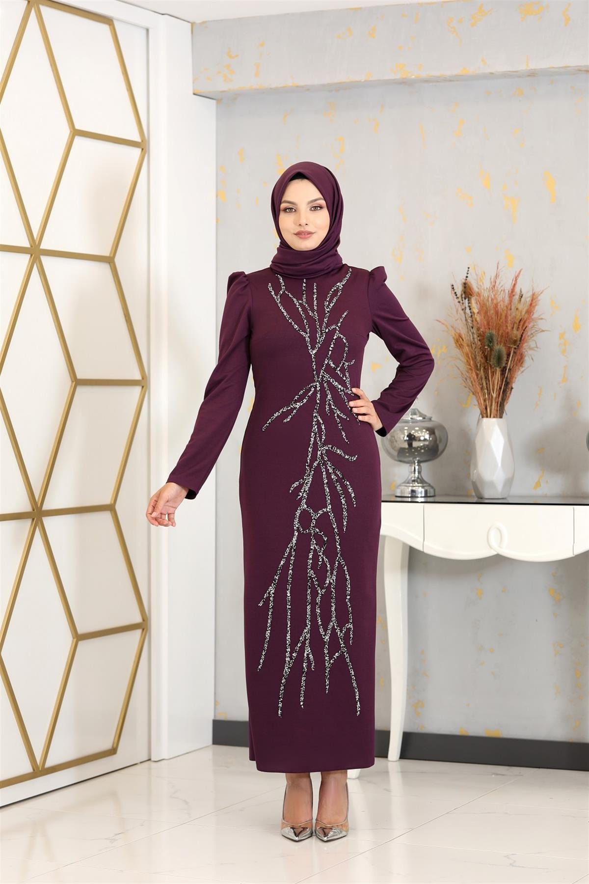 Aplik İşlemeli Kalem Tuana Kalem Tesettür Elbise - Mürdüm (tuana0005)