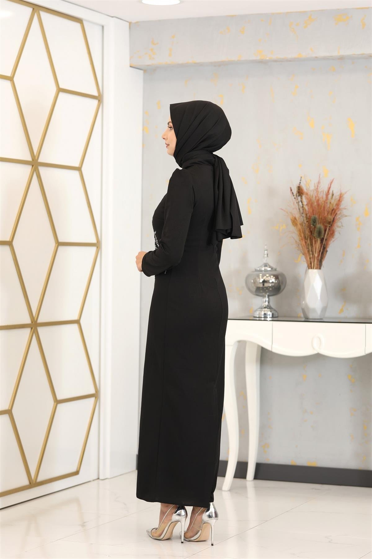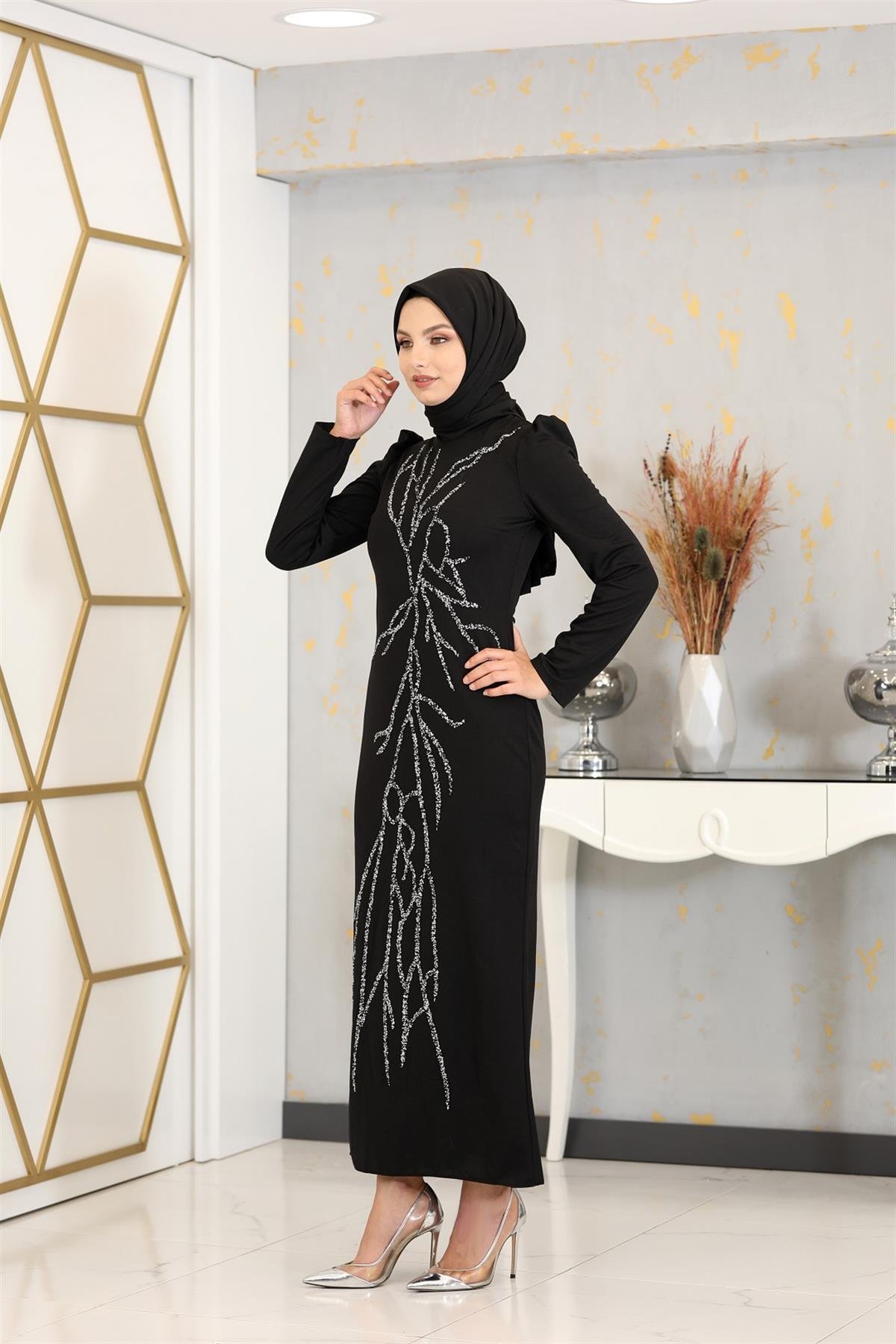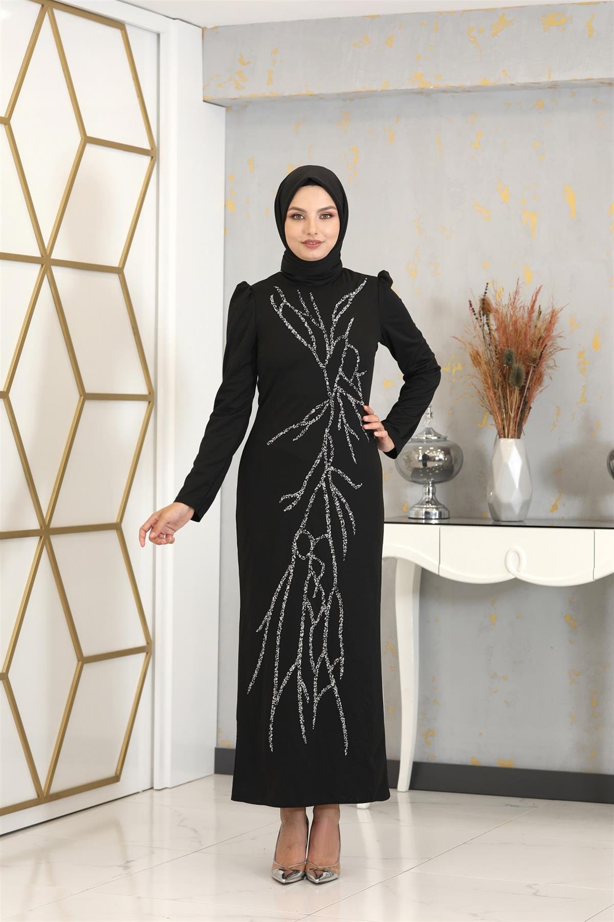 Aplik İşlemeli Kalem Tuana Kalem Tesettür Elbise - Siyah (tuana0006)