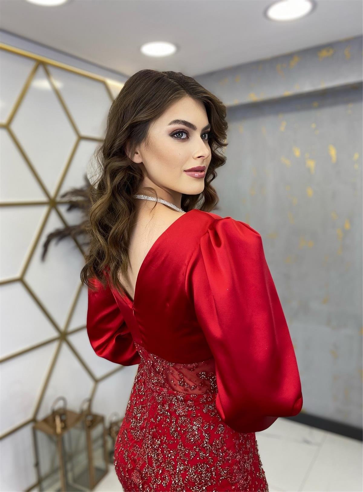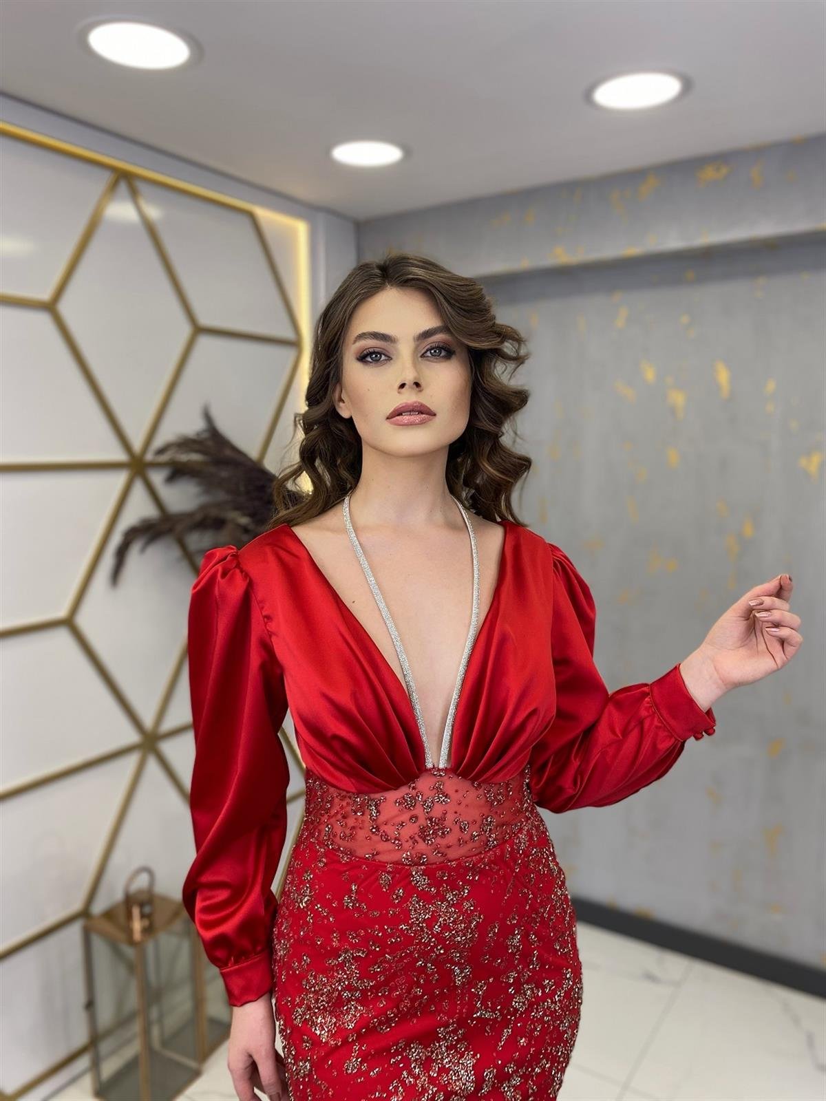 Boynu Taşlı Balon Kollu Hazal Abiye - Kırmızı (hazal0004)