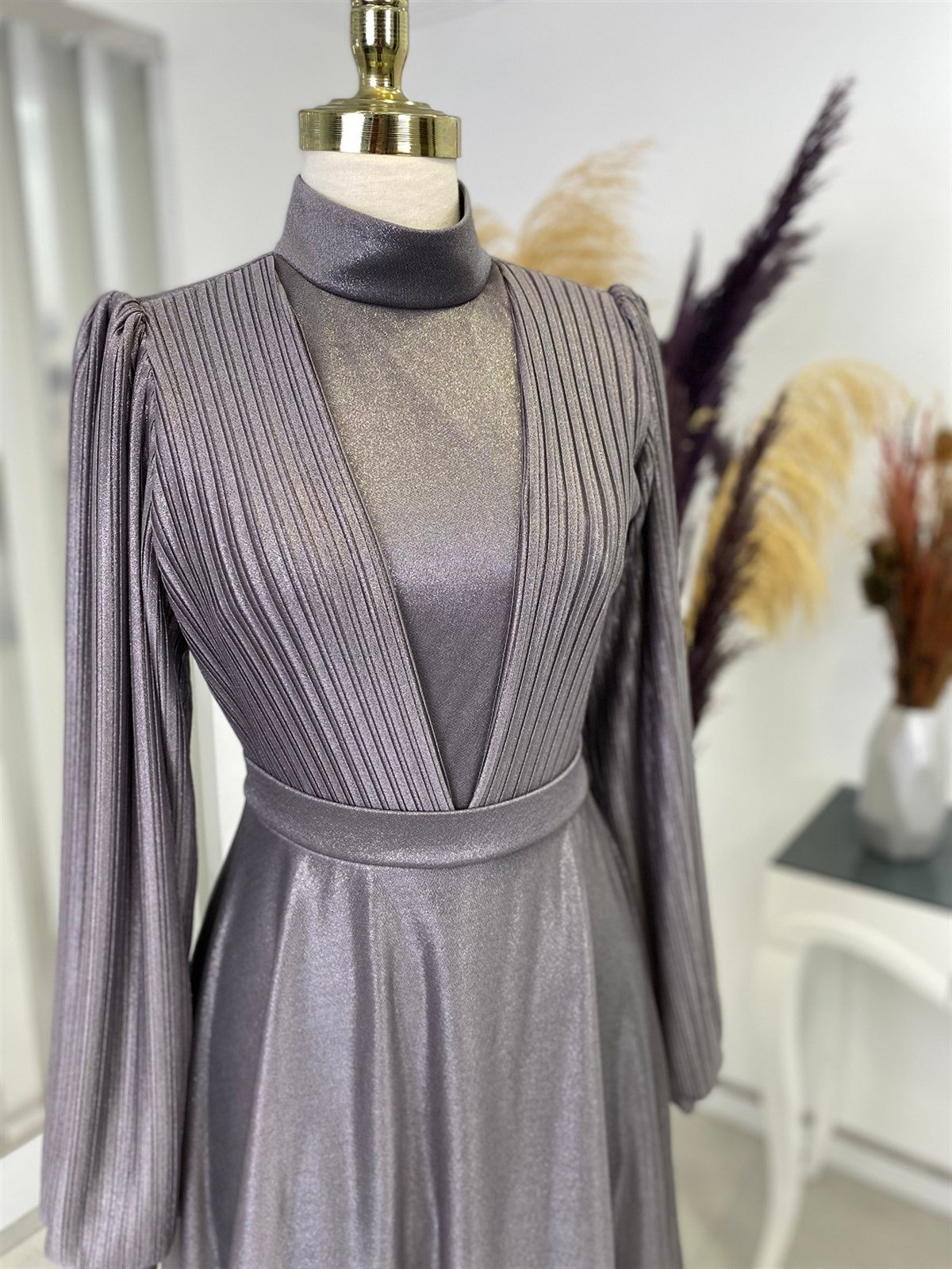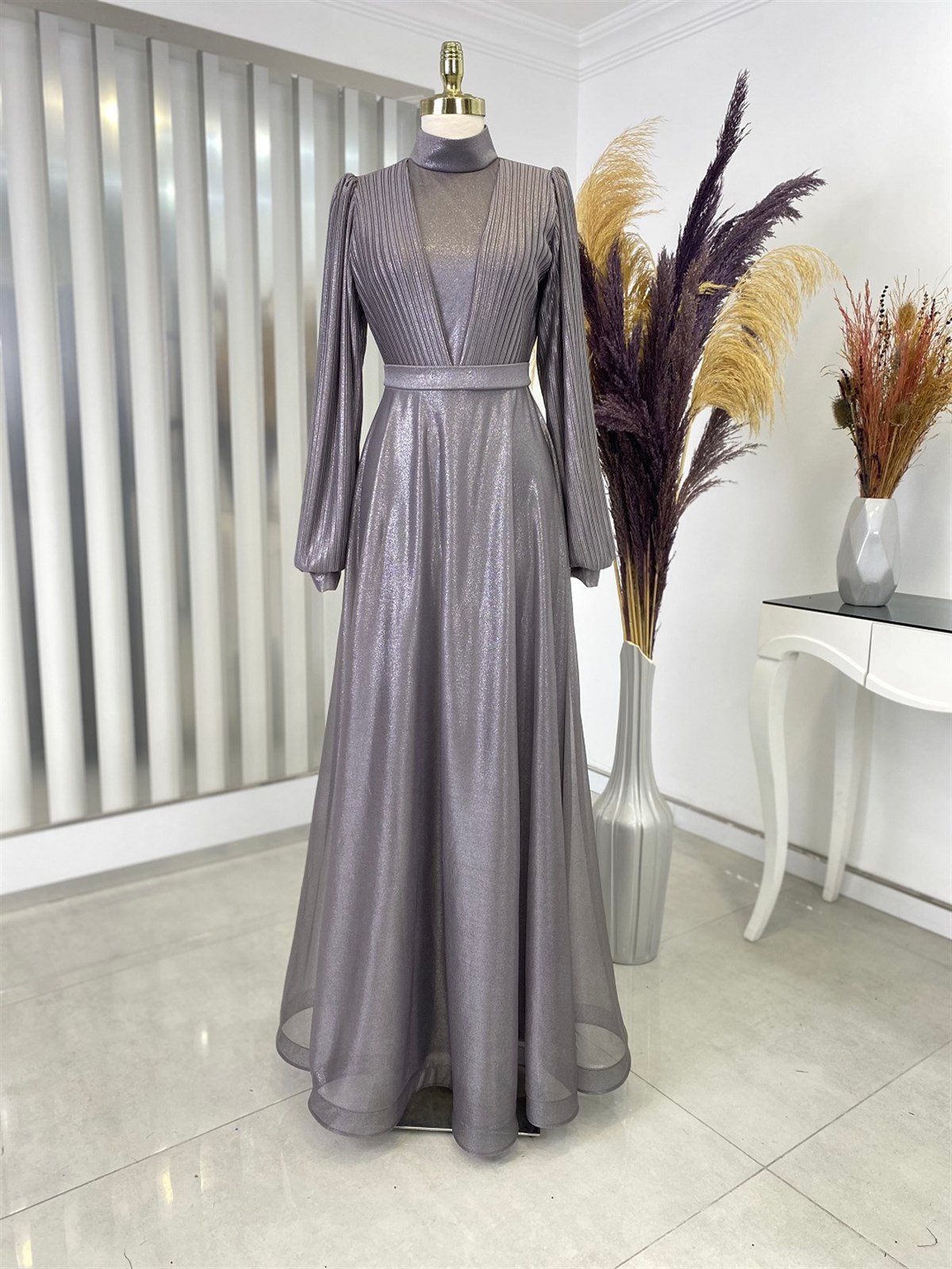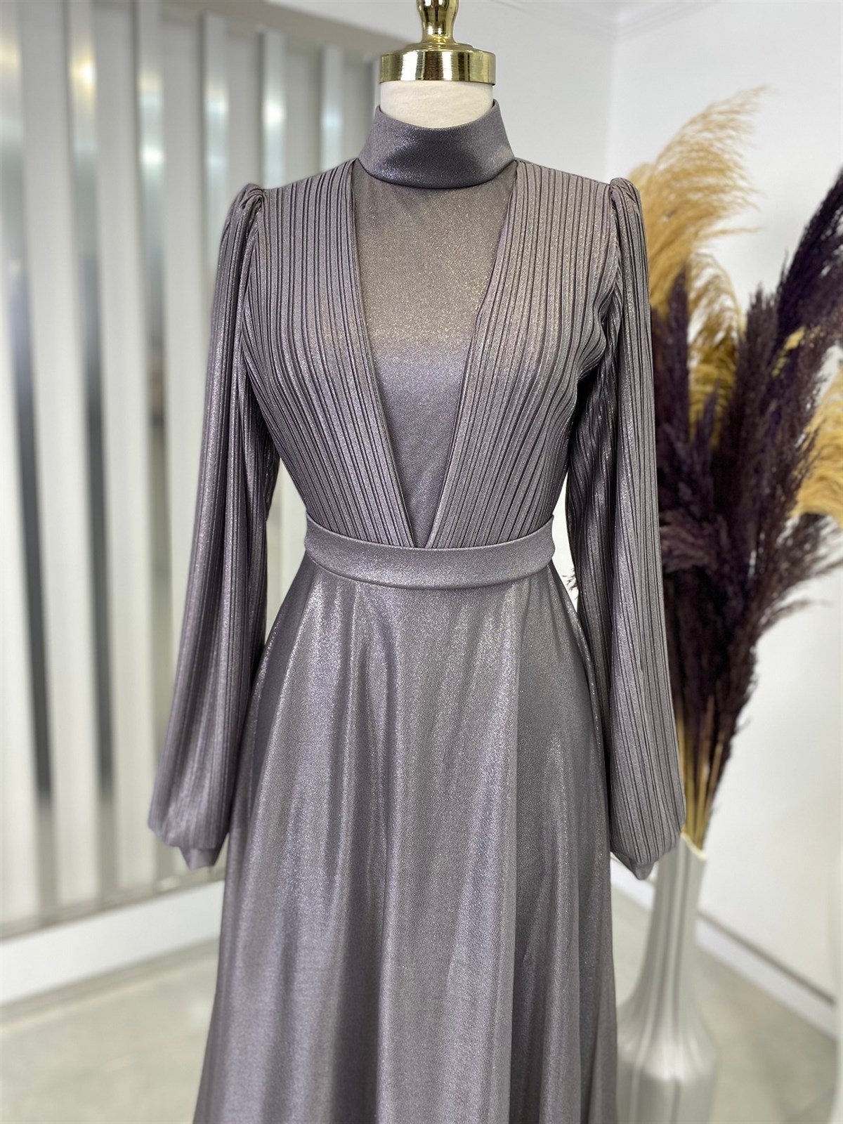Buse Piliseli Beli Kemerli Tesettür Abiye - Füme (buse0001)