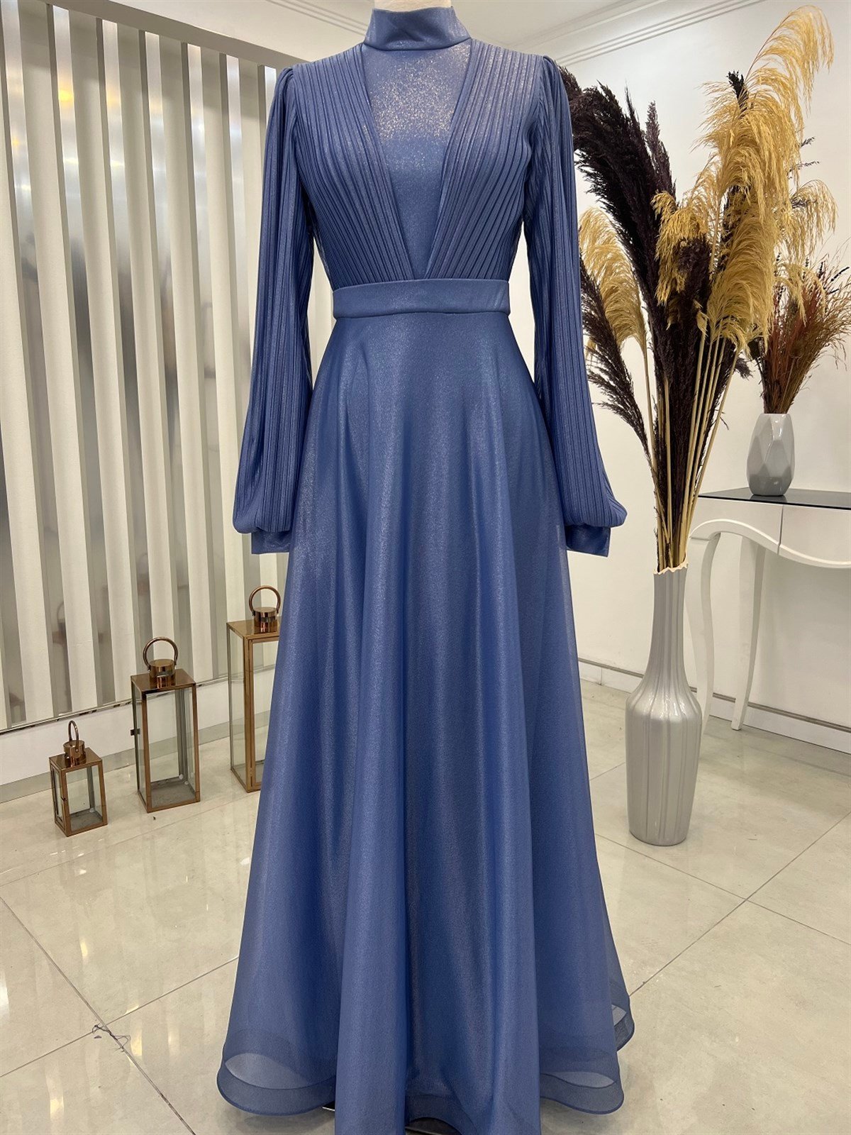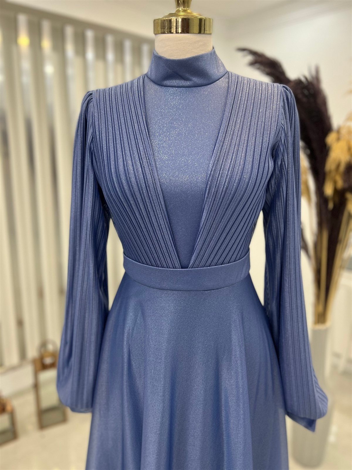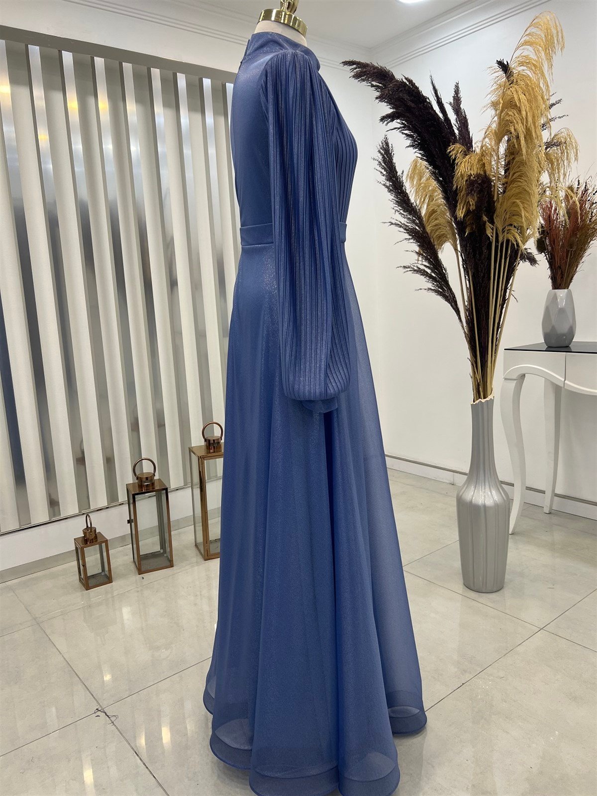 Buse Piliseli Beli Kemerli Tesettür Abiye - İndigo (buse0006)