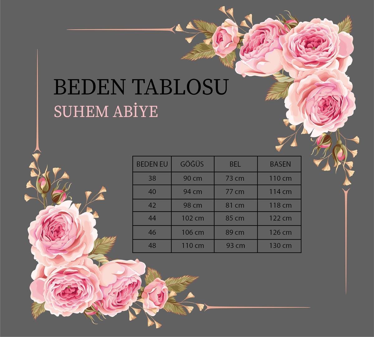 Suhem Abiye: Taş işlemeli, arkadan gizli fermuarlı, kolları piliseli, karpuz kollu, çıkarılabilir kemerli abiye modeldir. Ürün uzunluğu maksi boy olup toplamda 2 parçadan oluşmaktadır. Kumaş stili simli tül kumaştır. Yaka tipi hakim yakalıdır. Kalıbı tam kalıptır. Manken üzerindeki ürün 38 bedendir.