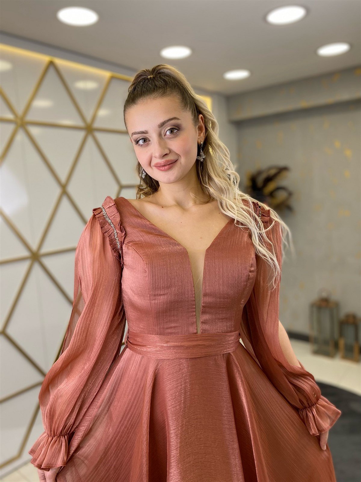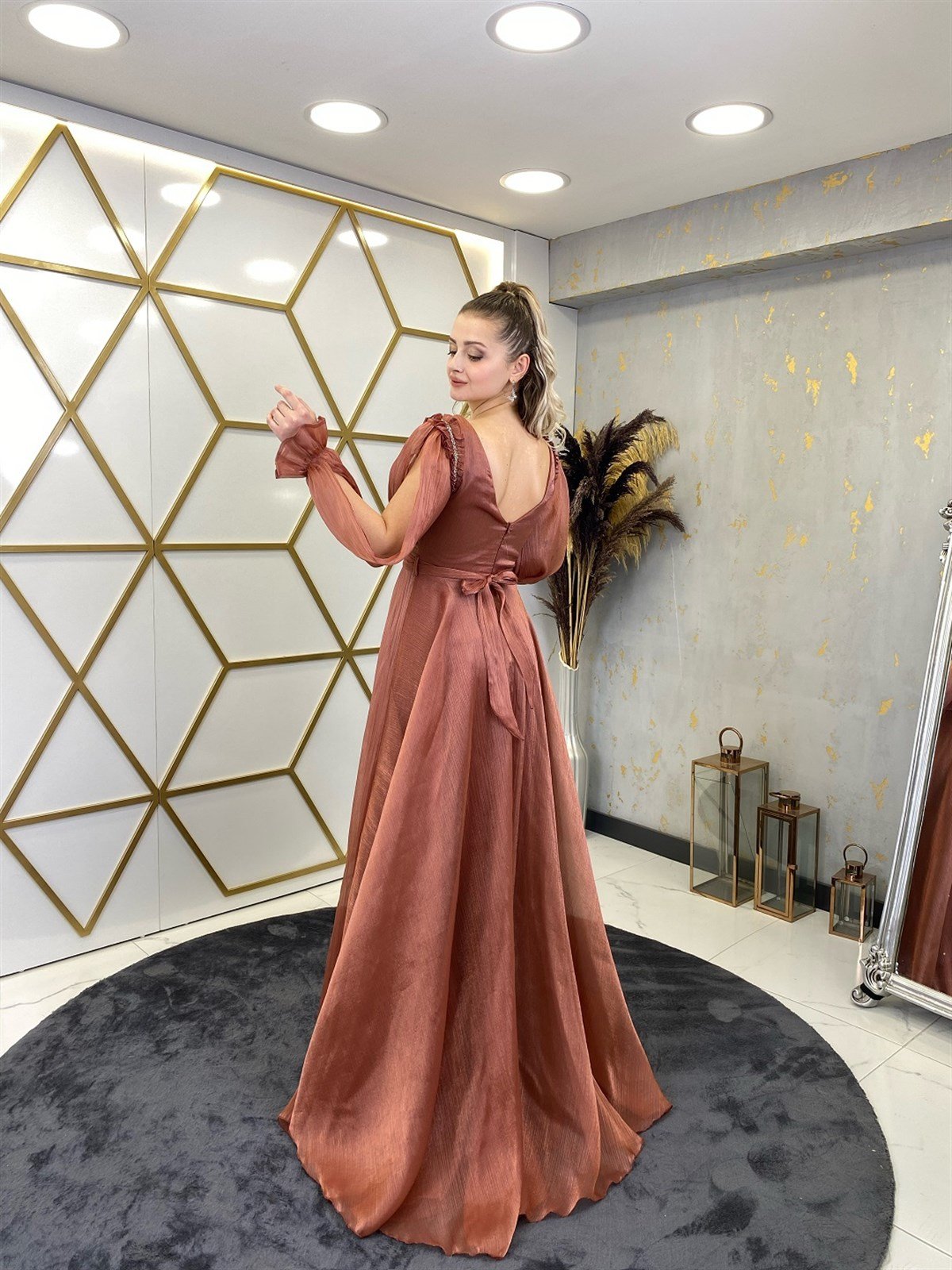 Kuşaklı Omuzları Taşlı V Yaka Sena Abiye - Kiremit (sena0005)