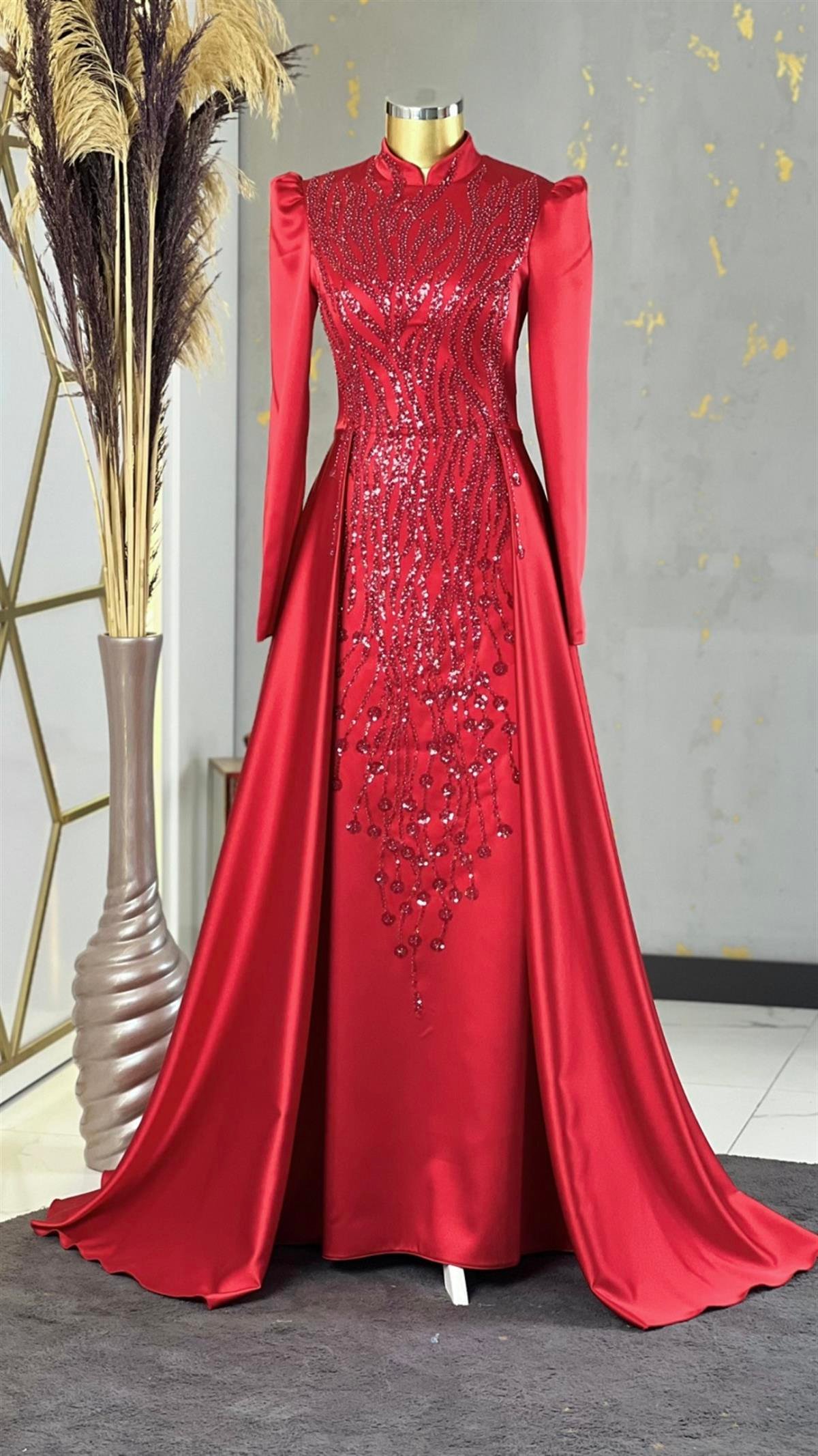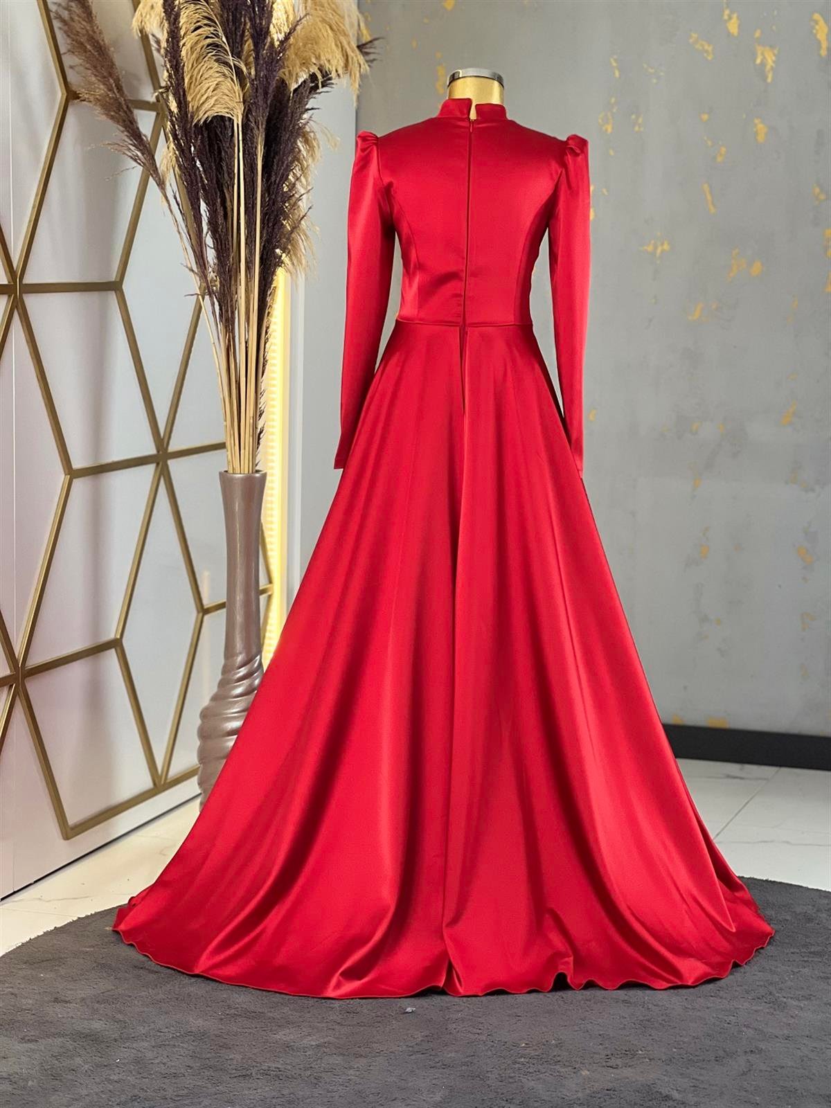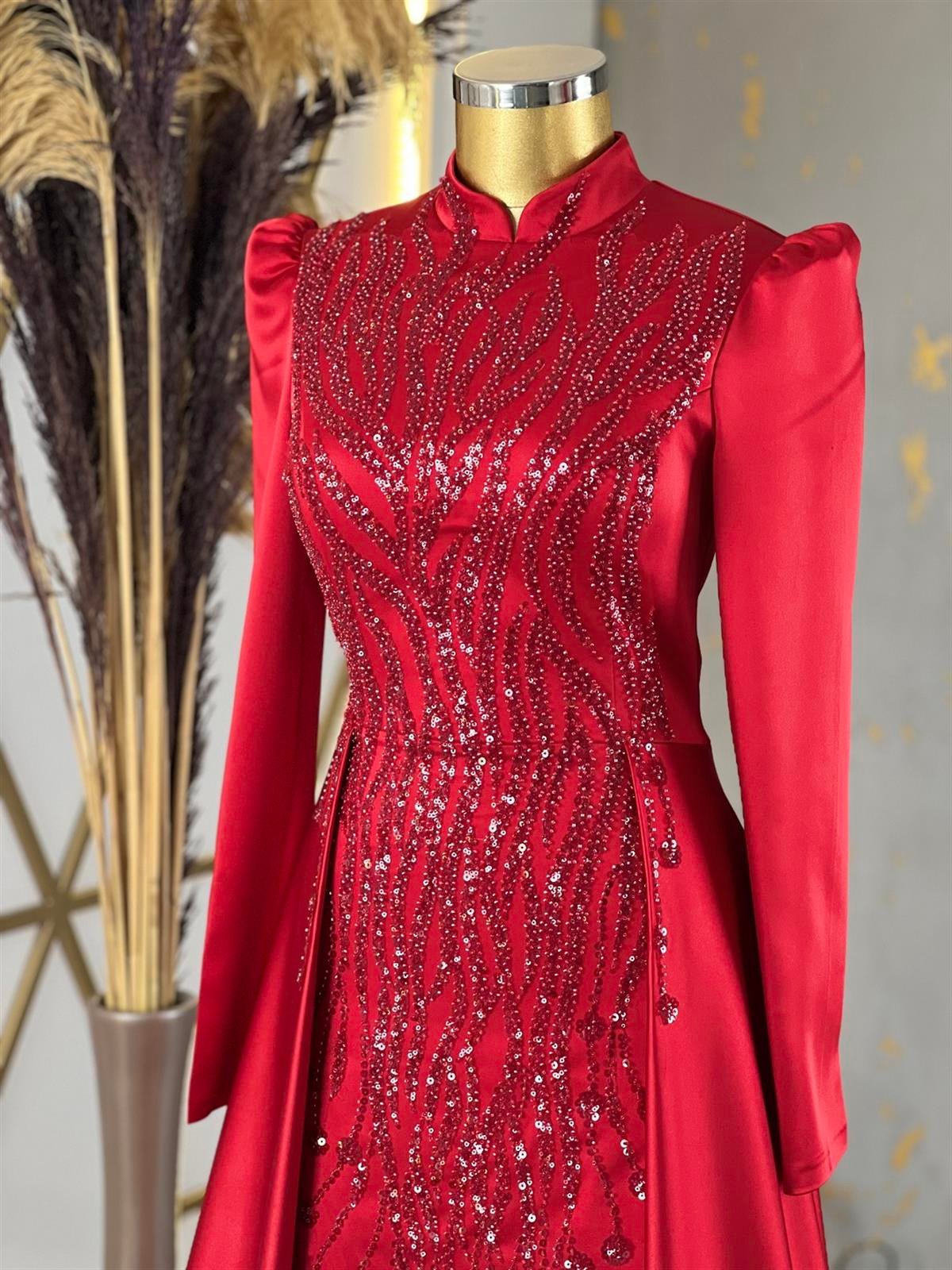Kuyruklu Aplik İşlemeli Hakim Yaka Damla Tesettür Abiye - Kırmızı (damla0008)