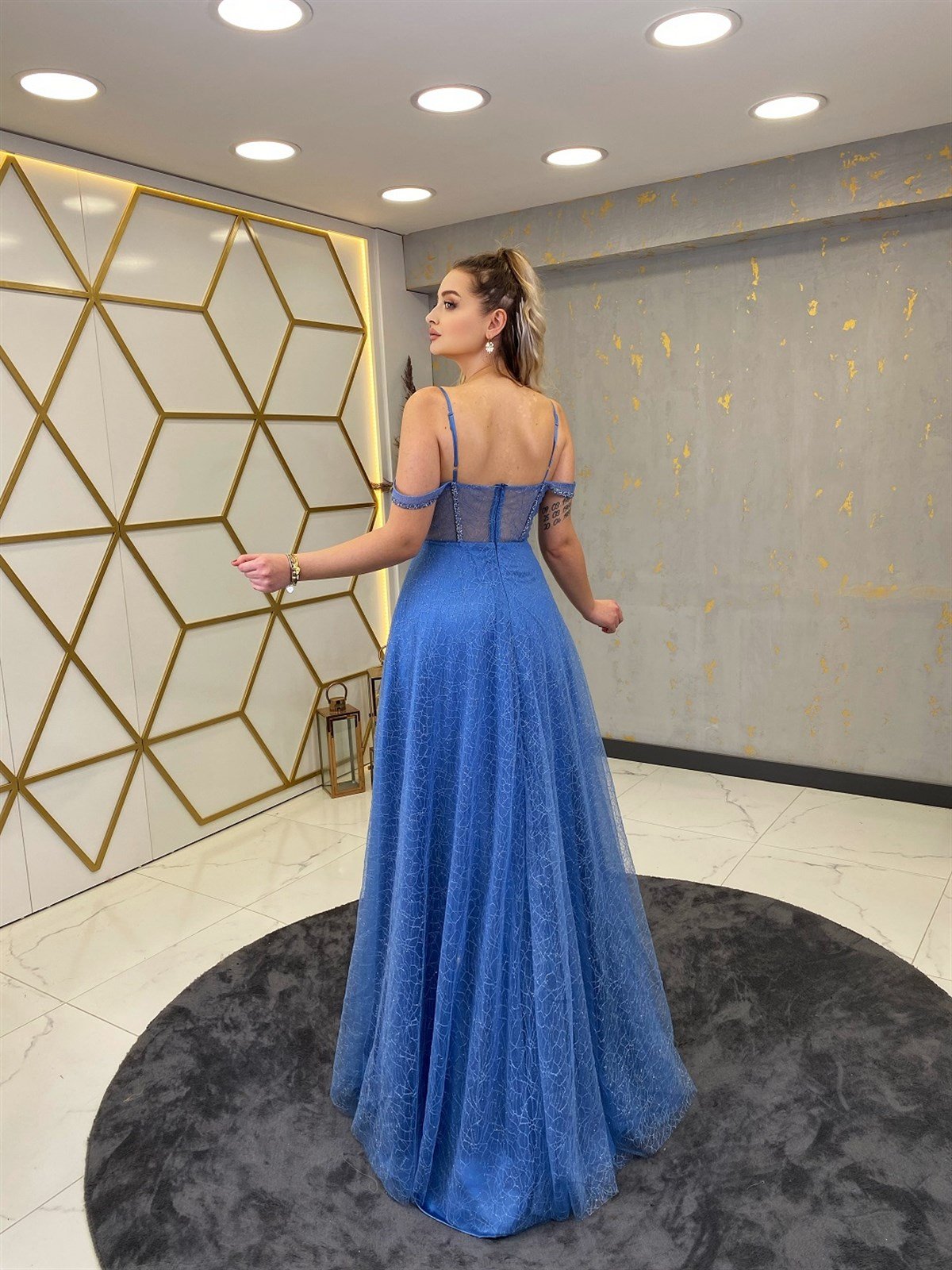 Transparan Detaylı Taş İşlemeli Askılı Hare Abiye - İndigo (hare0005)