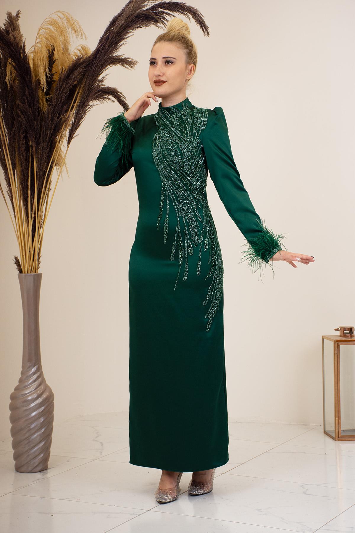 Önü Boncuk Aplik İşleme Kolları Tüylü Nara Abiye Zümrüt